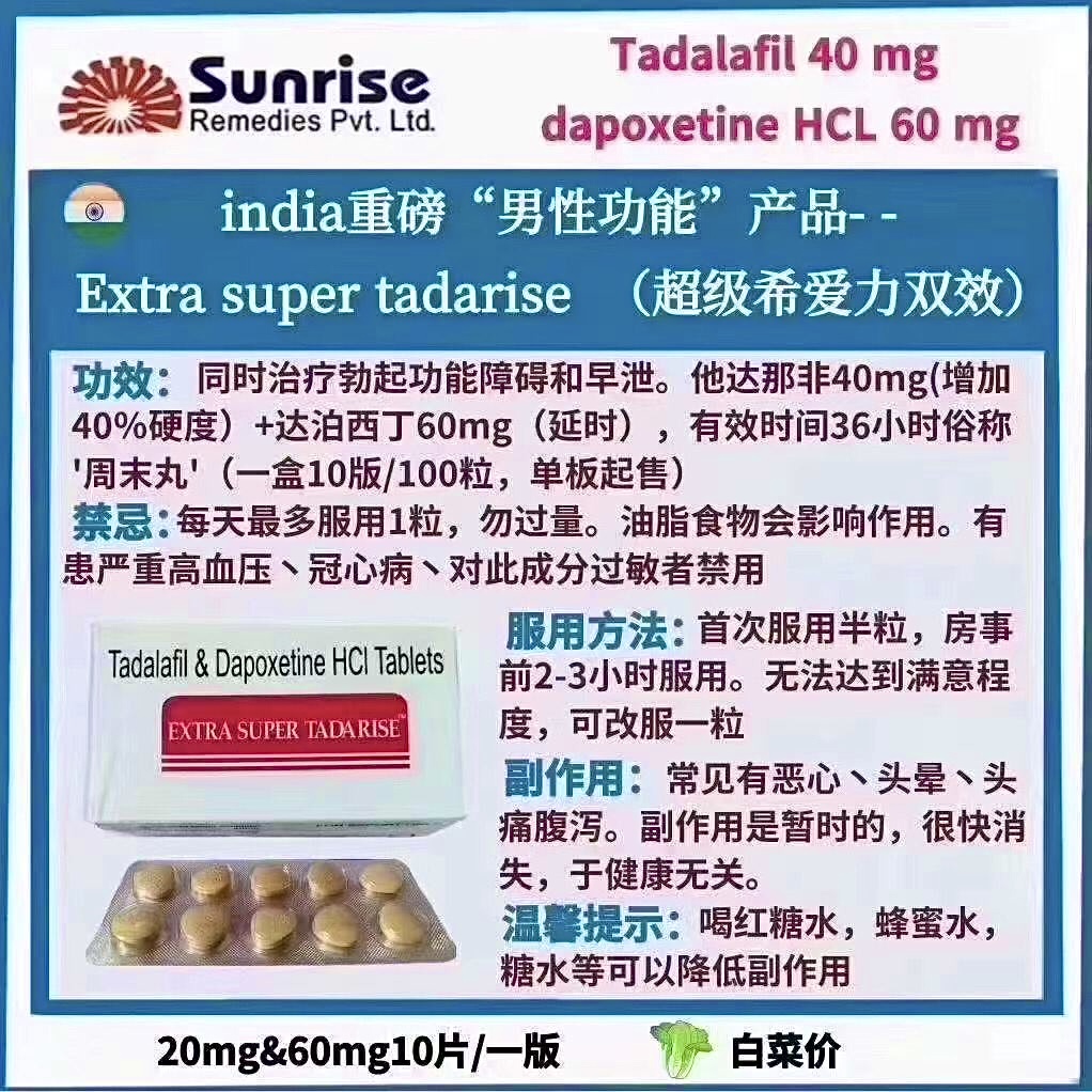 ◾️超级希爱力(双效) 用于解决男性勃起和早泄的药物,由太阳日升药业出品,超级希爱力算是老大哥,以稳定效果表现和超高性价比一直长效多年,口碑优秀,是曾经许多人接触这类产品的入门必选产品。 ◾️成分:他达那非40mg+达泊西汀60mg ◾️效果:助勃增硬+延时 ◾️特点:性价比高 药效持续长达36小时 ◾️规格:一板10粒一盒100粒