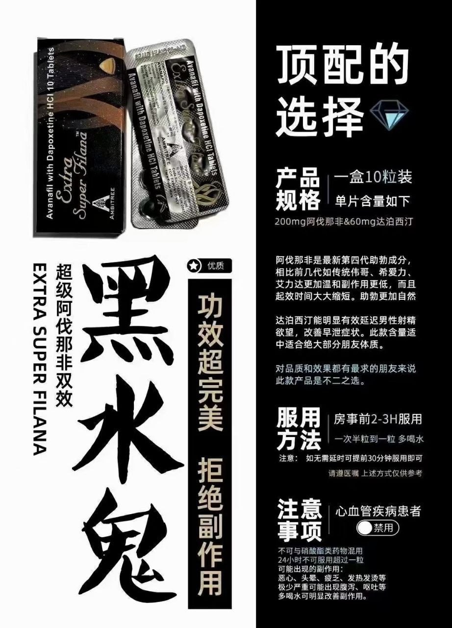 ◾️黑水鬼(双效) 阿伐那非黑水鬼算是安必成药业双效里面的高端产品,很多用户看到200mg阿伐那非助勃剂量觉得很高,这个剂量相当于艾力达伐地那非40mg左右剂量甚至还要低一些,主打均衡舒适,可喝酒,非常适合追求效果的同时又想副作用低的用户。 ◾️成分:阿伐那非200mg+达泊西汀60mg ◾️效果:助勃增硬+延时 ◾️特点:均衡舒适 副作用低 可喝酒 ◾️规格:一盒10粒