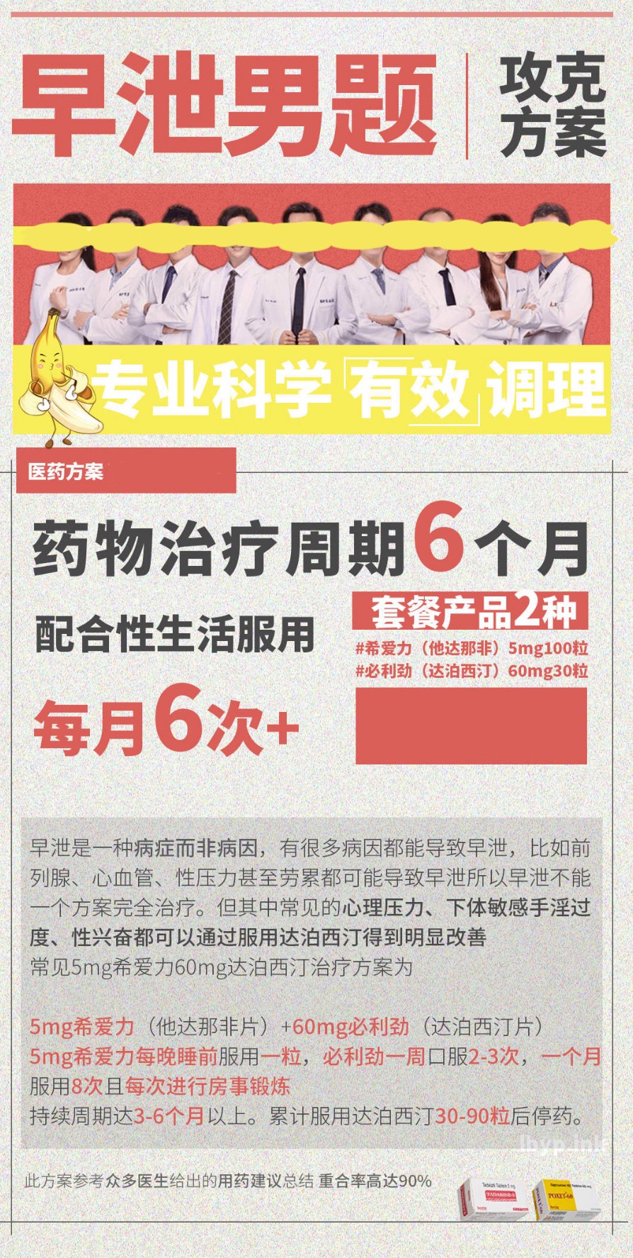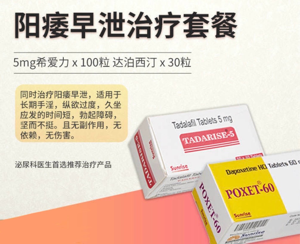 ◾️黄金套餐(希爱力+必利劲) 目前治疗阳痿早泄最科学有效适合的主流药物,泌尿科医生首选推荐治疗产品。5mg每晚睡前温水送服一粒,治疗勃起硬度差勃起障碍问题。达泊西汀必利劲一周口服2次,一个月服用8次,且进行房事锻炼。常见的心理压力、下体敏感手淫过度、性兴奋都可以通过服用达泊西汀得到明显改善。这里值得一提的是达泊西汀需要进行房事锻炼且需要配合周期性的身体机能训练,光吃不练假把式没有多大意义,勿单独用药。 ◾️成分:他达那非5mg+达泊西汀 60mg。 ◾️效果:调理治疗 ◾️特点:效果好 性价比高 ◾️规格:5mg他达那非100粒+达泊西汀3板30粒