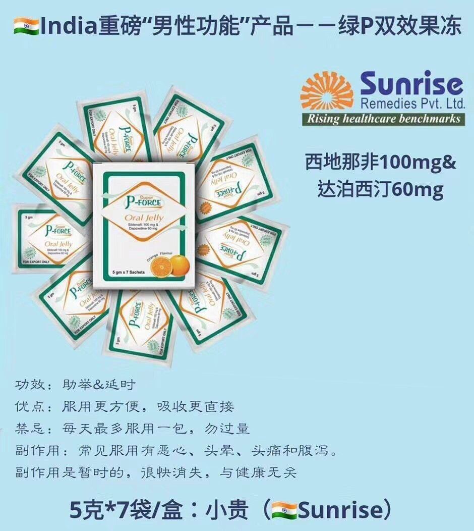◾绿果冻(双效) 用于解决男性勃起和早泄的药物,液体胶状果酱,非常适合服用片剂有恶心呕吐症状用户使用,分子结构小容易入口和吸收,且携带方便,服用不尴尬。 ◾成分:西地那非100mg+达泊西汀60mg ◾效果:助勃增硬+延时 ◾特点:吸收快 易携带 ◾规格:一盒7包