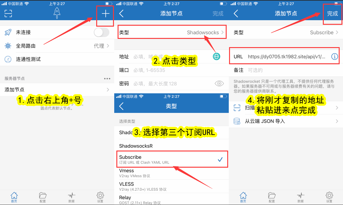 打开小火箭首页右上角+号 - 类型选择第一个通用方法个订阅URL -